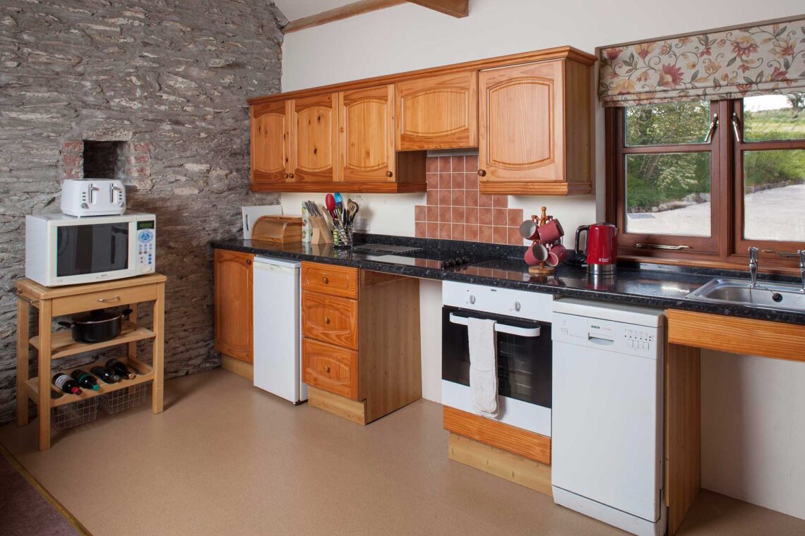 The open-plan living area feels bright and welcoming, with exposed timber beams adding warmth and character. Large patio doors open onto a private patio, which can also be accessed directly from one of the bedrooms. The fully equipped kitchen includes everything you need for a relaxing self-catering stay, while electric central heating and a cosy wood-burner ensure comfort all year round.