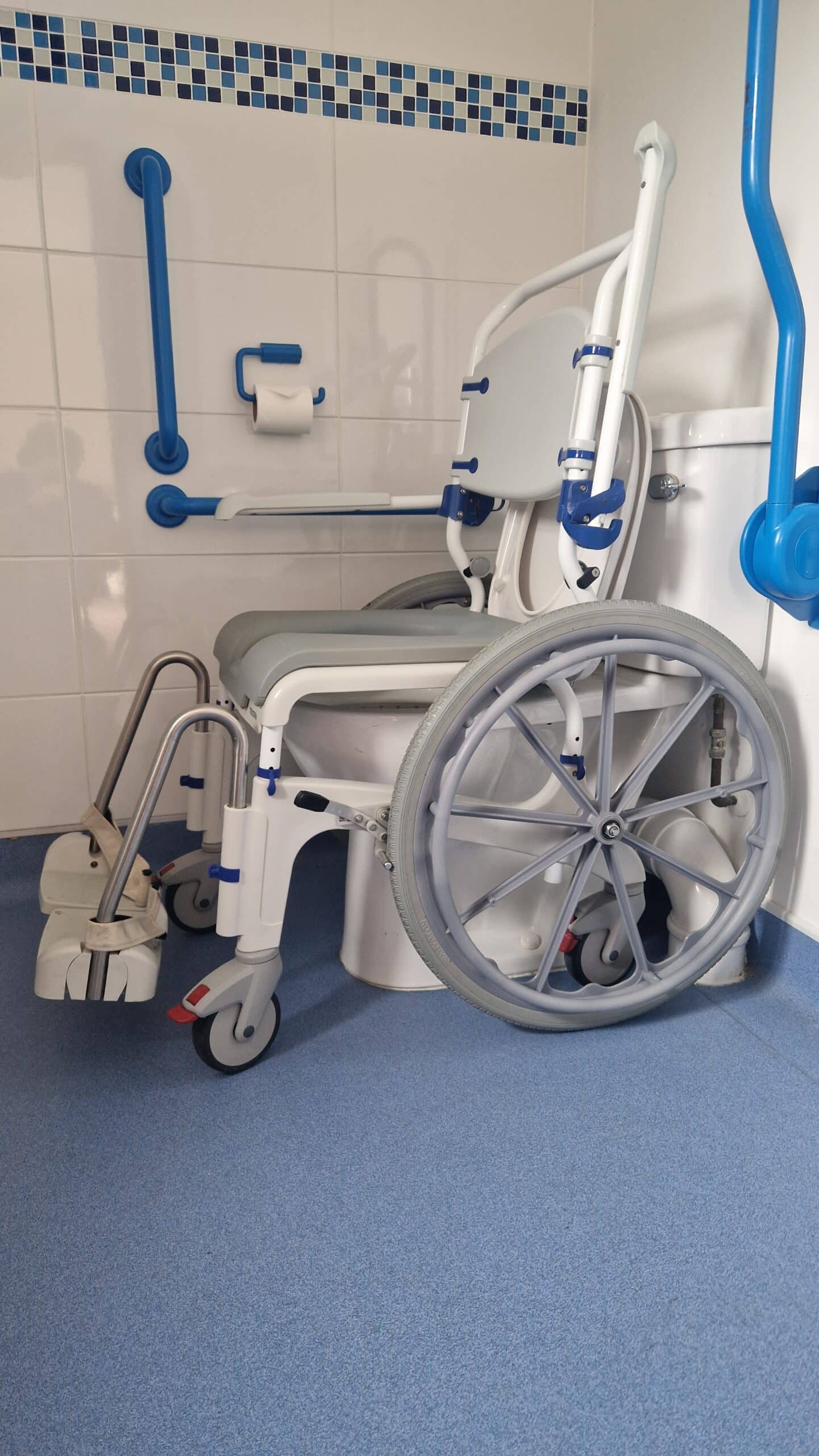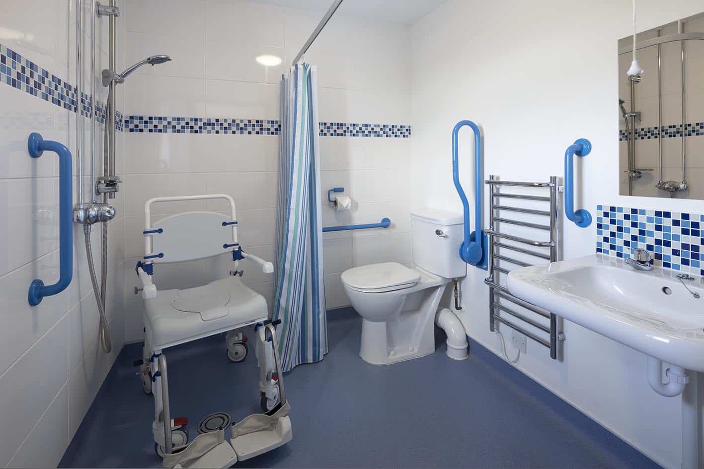 Each cottage includes either a ceiling track hoist in the bedroom, allowing easy transfer from the bed to a wheelchair or shower chair, or a BHM Junior portable hoist. Both use sling attachments compatible with Oxford hoists.
