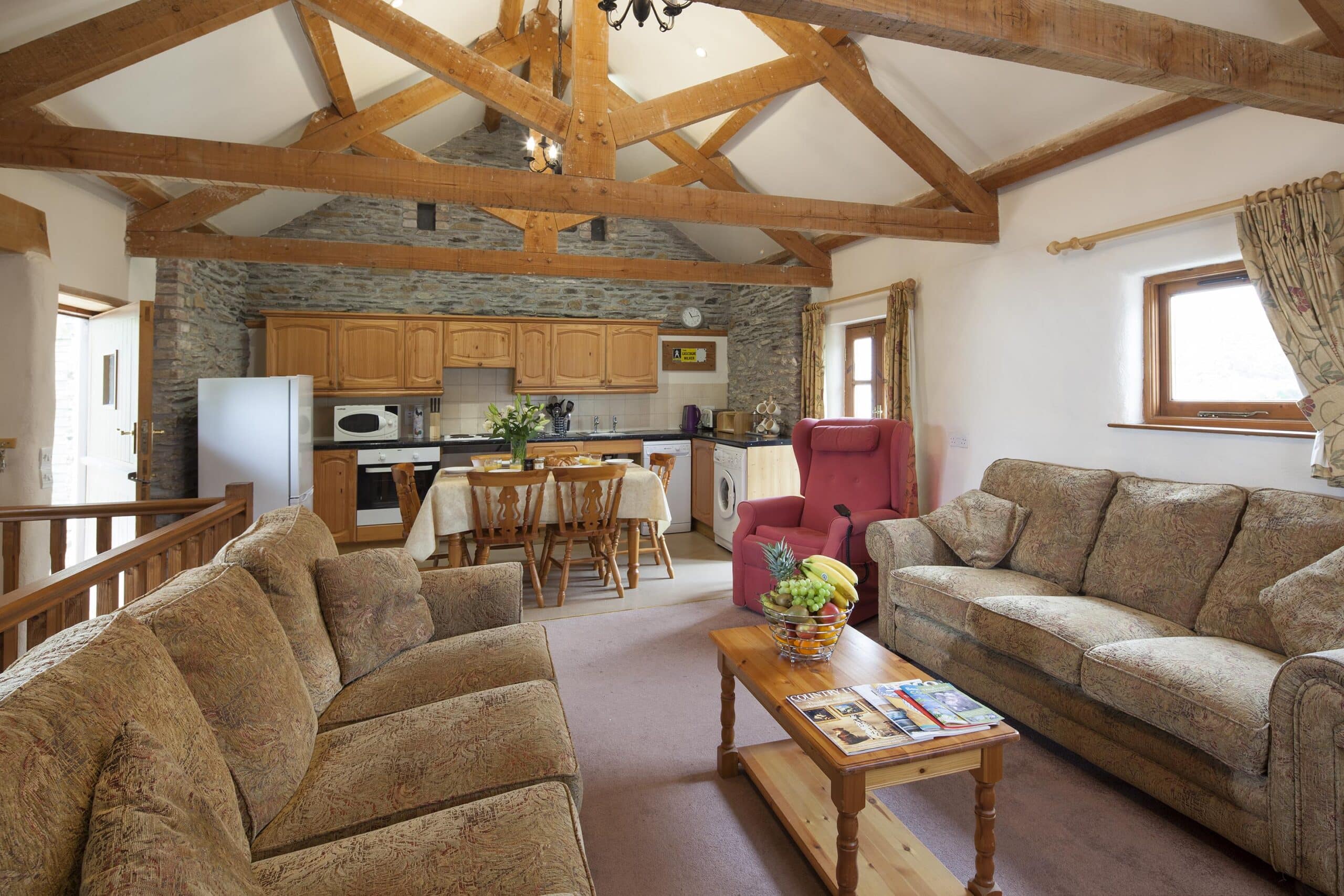 The sitting room at Valley View is a warm and welcoming space designed for relaxation. Its vaulted ceiling, exposed timber beams, and comforting wood-burner create a perfect blend of rustic charm and modern comfort. A Smart TV lets you unwind with your favourite programmes or enjoy a cosy film night after a day exploring Cornwall.